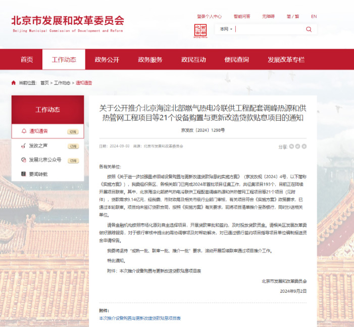 9月2日,,,,,北京市发改委印发《北京市生长和刷新委员会关于果真推介北京海淀北部燃气热电冷联供工程配套调峰热源和供热管网工程项目等21个装备购置与更新刷新贷款贴息项目的通知》(京发改〔2024〕1298号),,,,,公司申报的北京海淀北部燃气热电冷联供工程配套调峰热源和供热管网工程项目等三个项目位列其中。。。。。。本次申报预计两年期共收到300万-700万元项目贴息资金,,,,,将有用助力公司效益提升。。。。。。